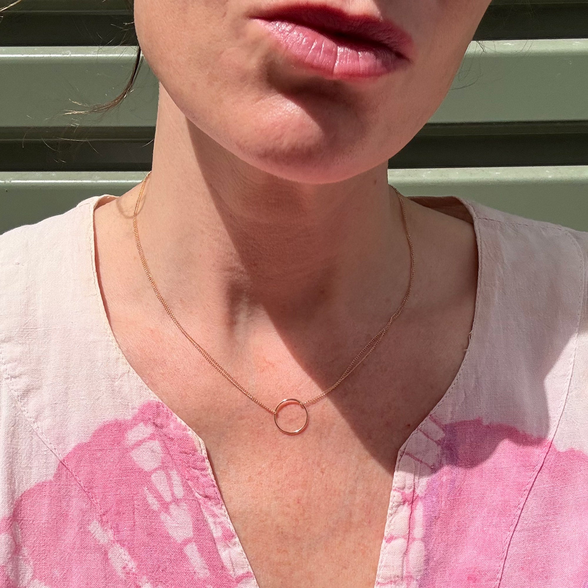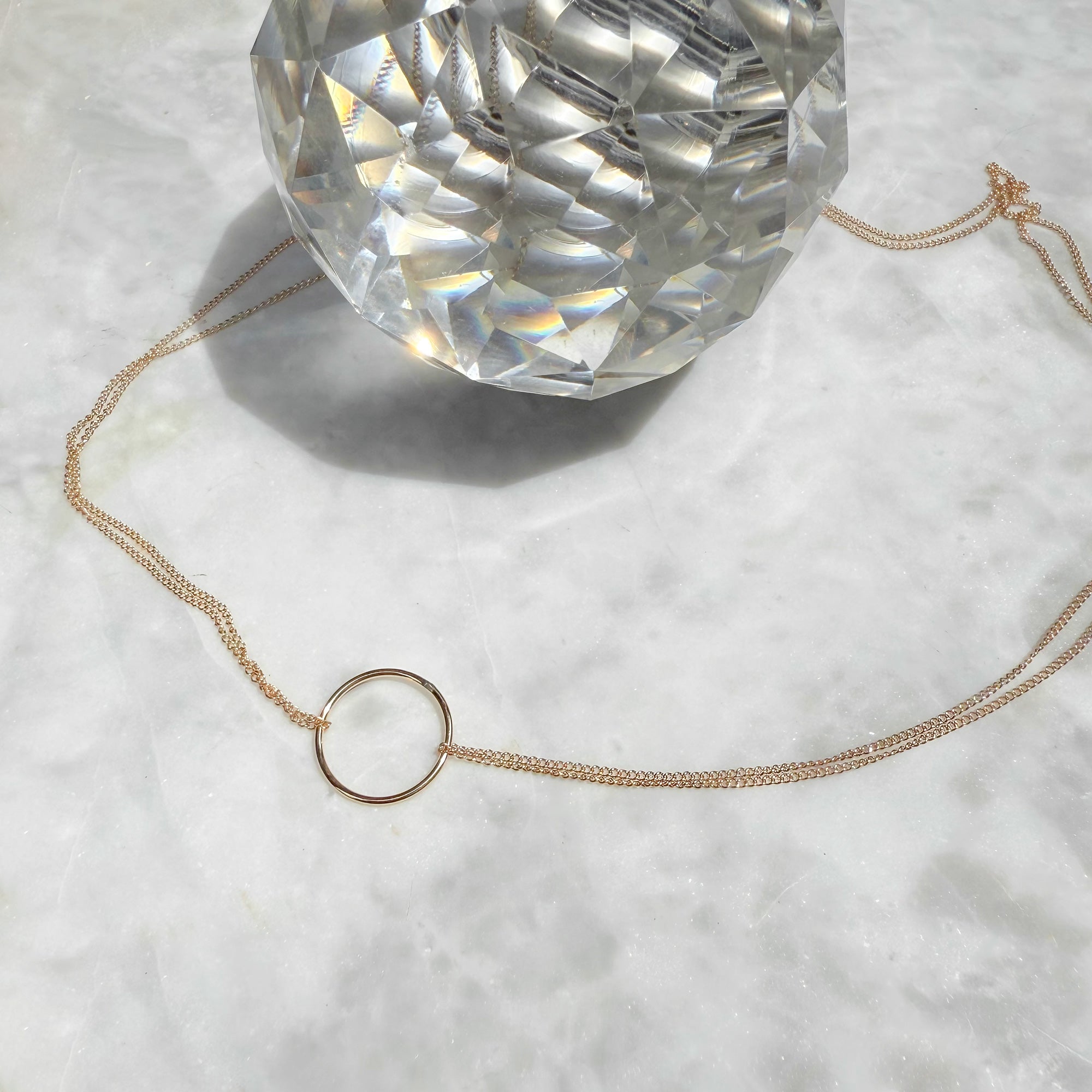 A fine gold hoop necklace suspended from a delicate curb chain. The double layer of chain on each side adds subtle texture to this simple, refined design.