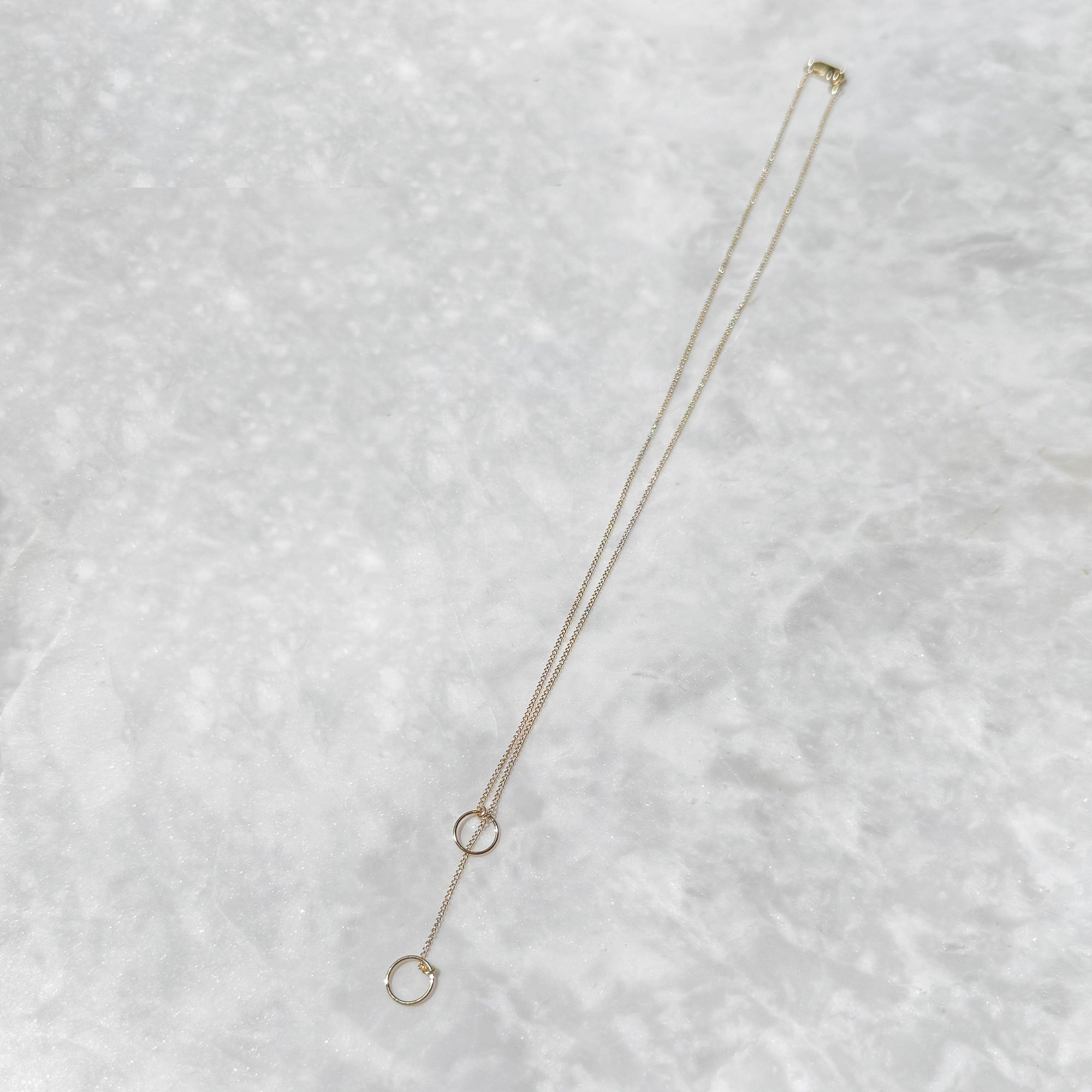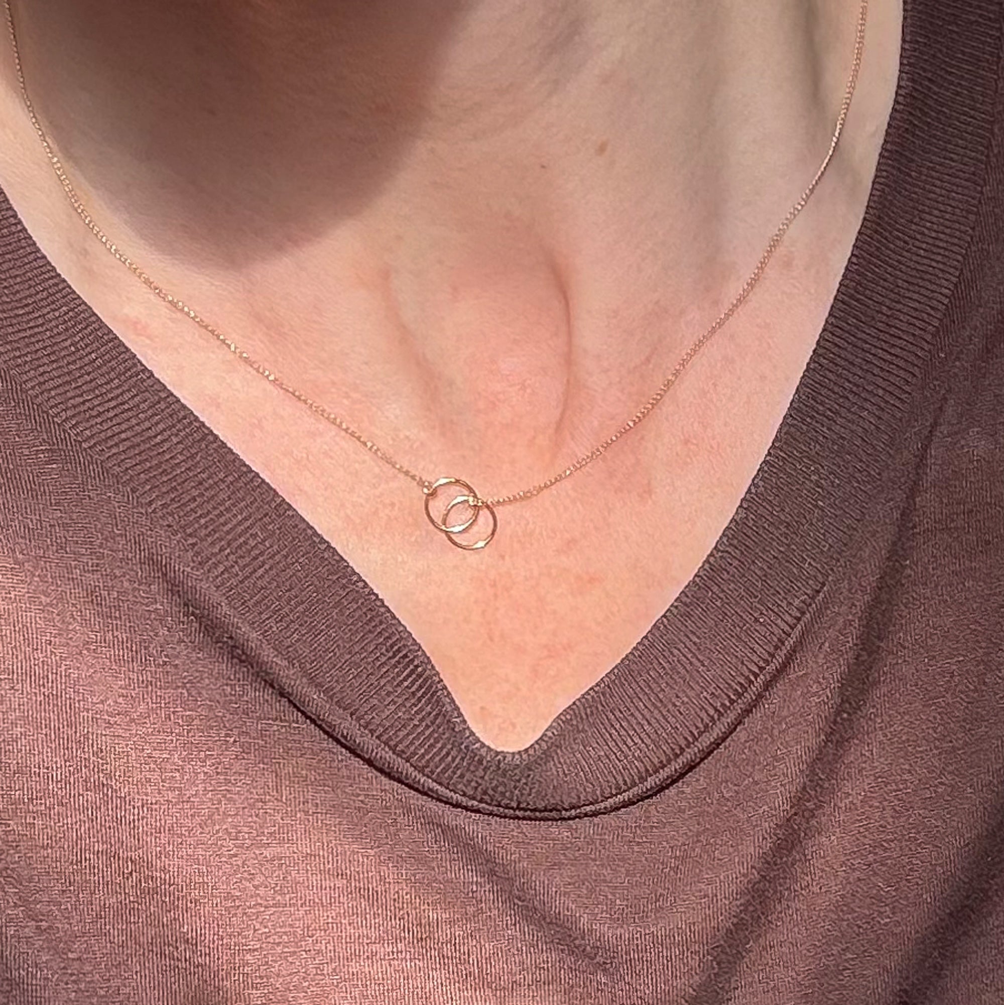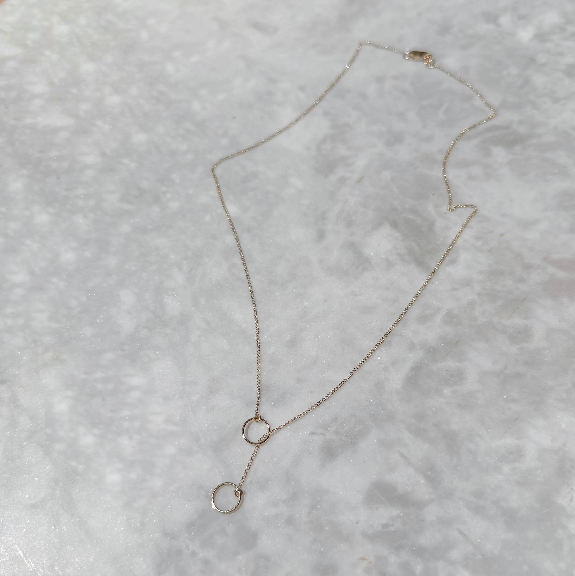 A sweet lariat-style necklace featuring two interlinking rings on a fine chain with a clasp at the back. Such a pretty and versatile piece of jewellery.
