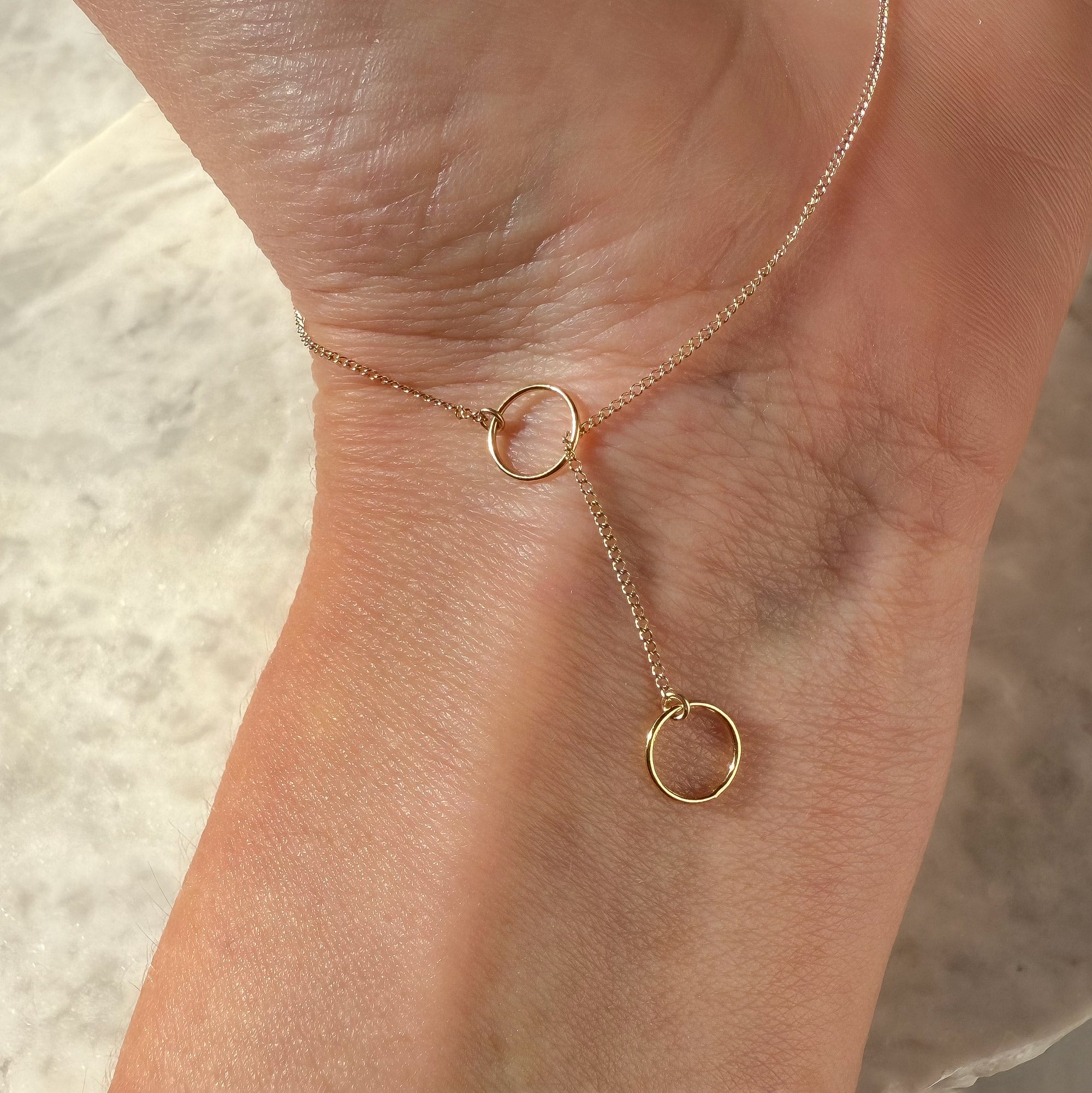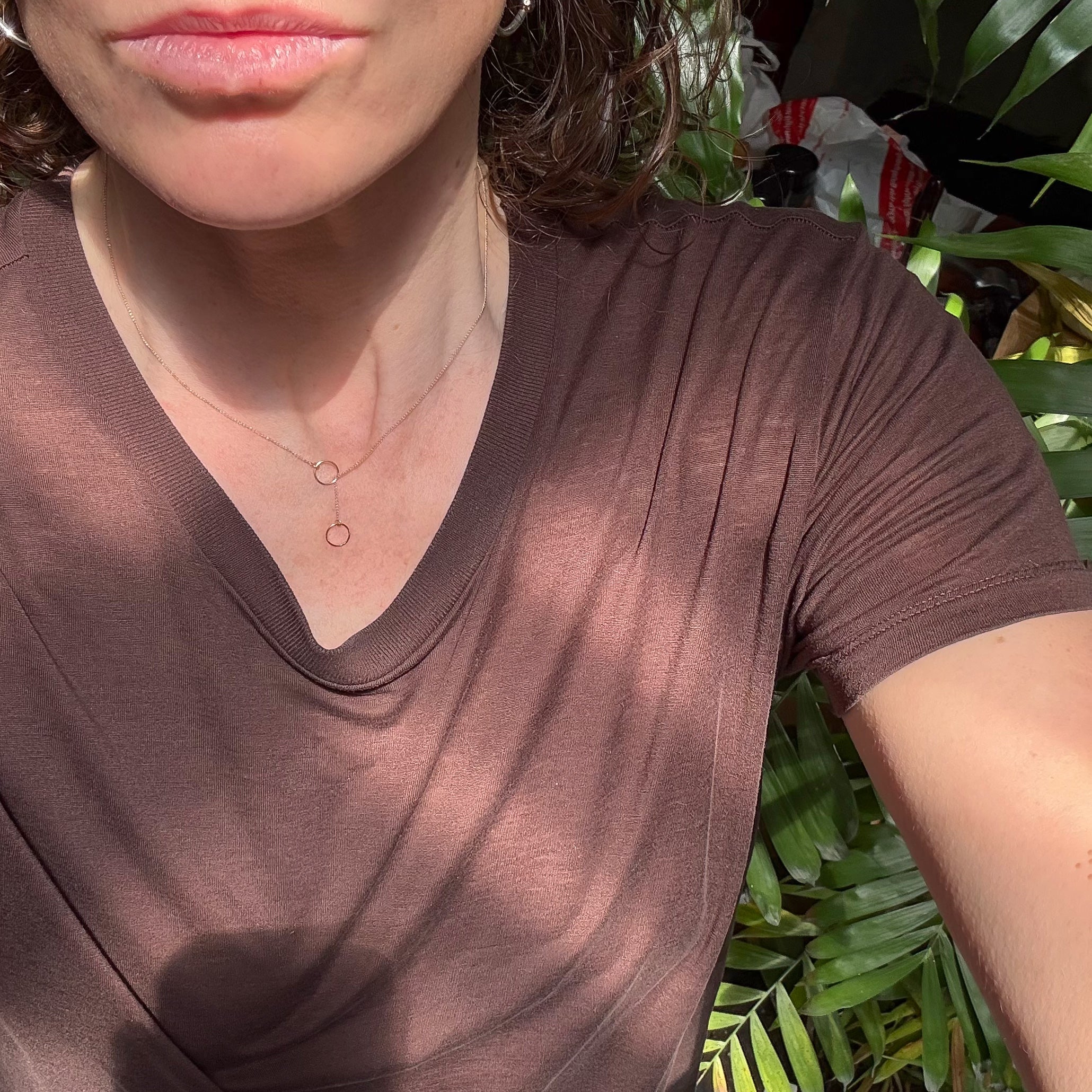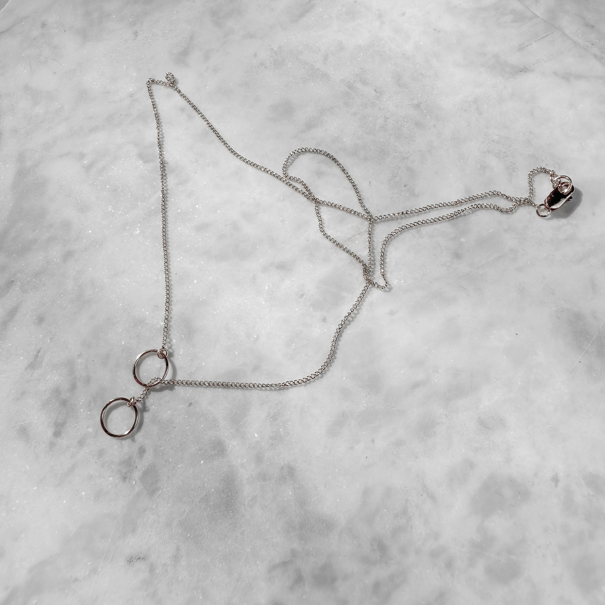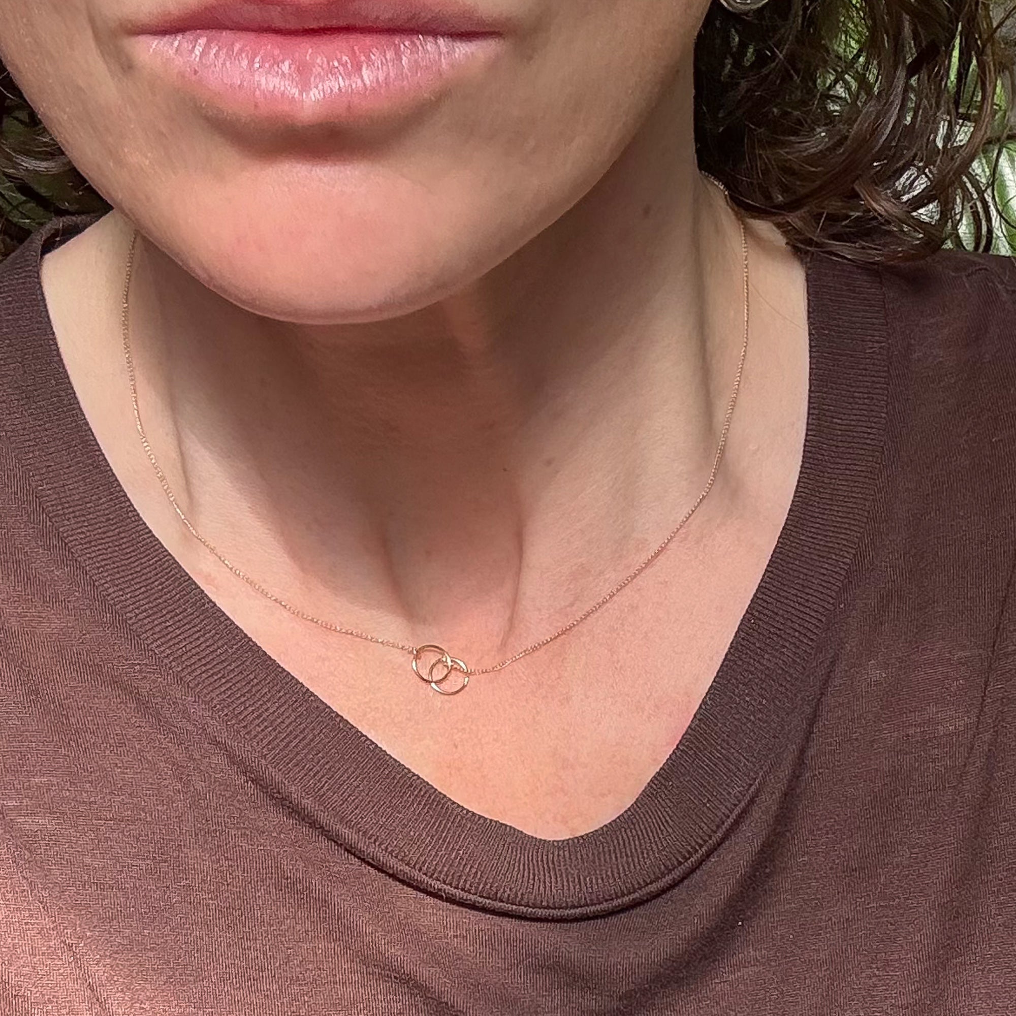 A sweet lariat-style necklace featuring two interlinking rings on a fine chain with a clasp at the back. Such a pretty and versatile piece of jewellery.