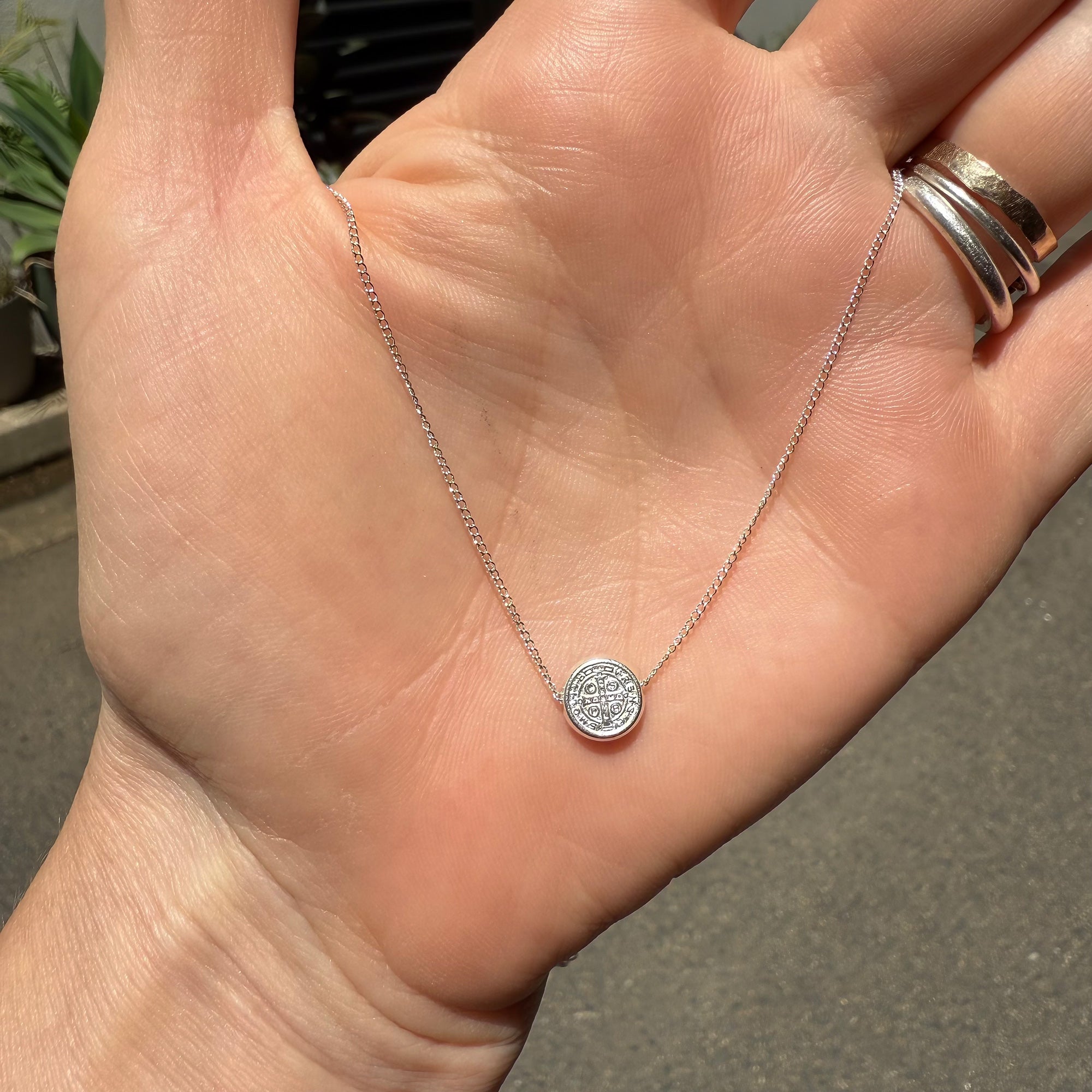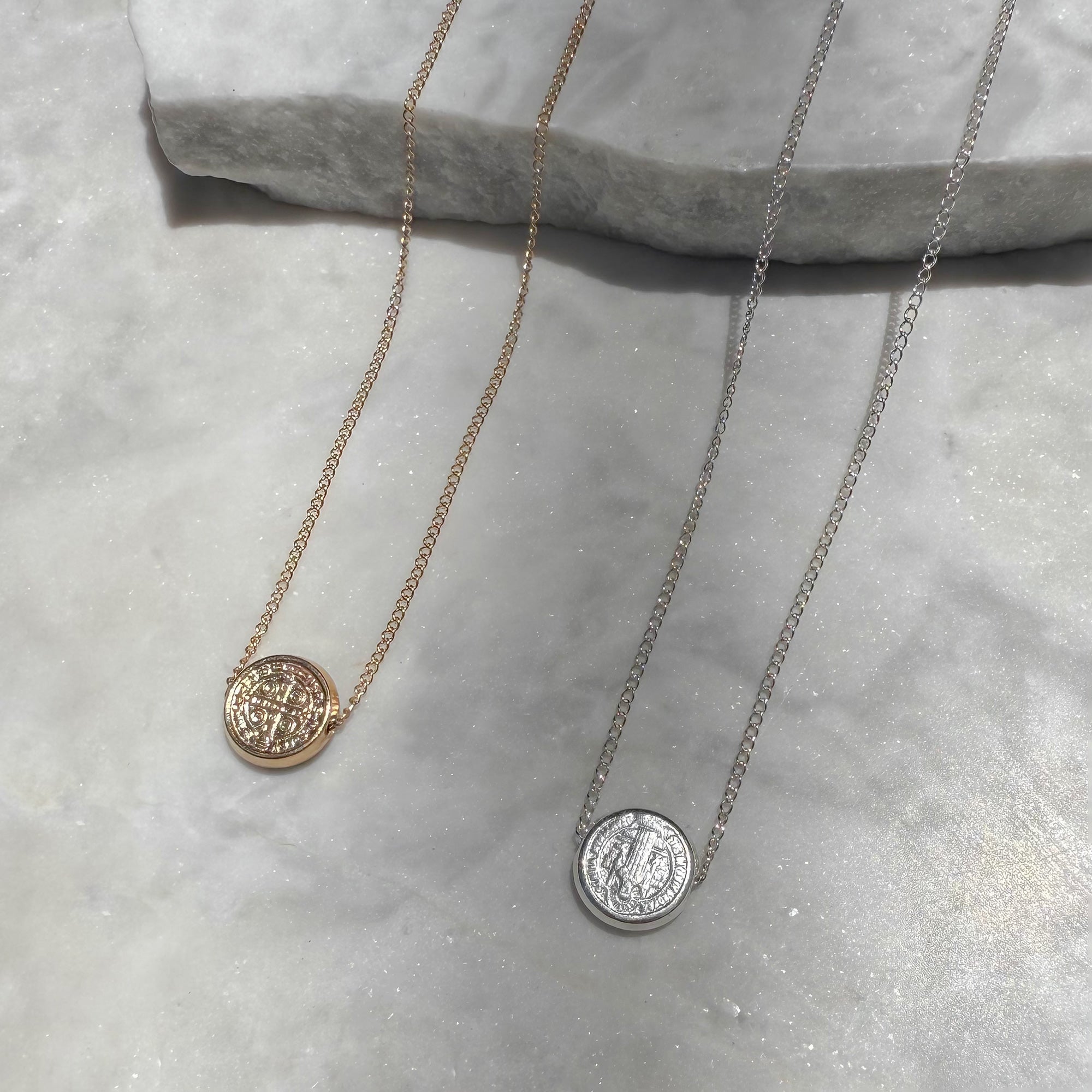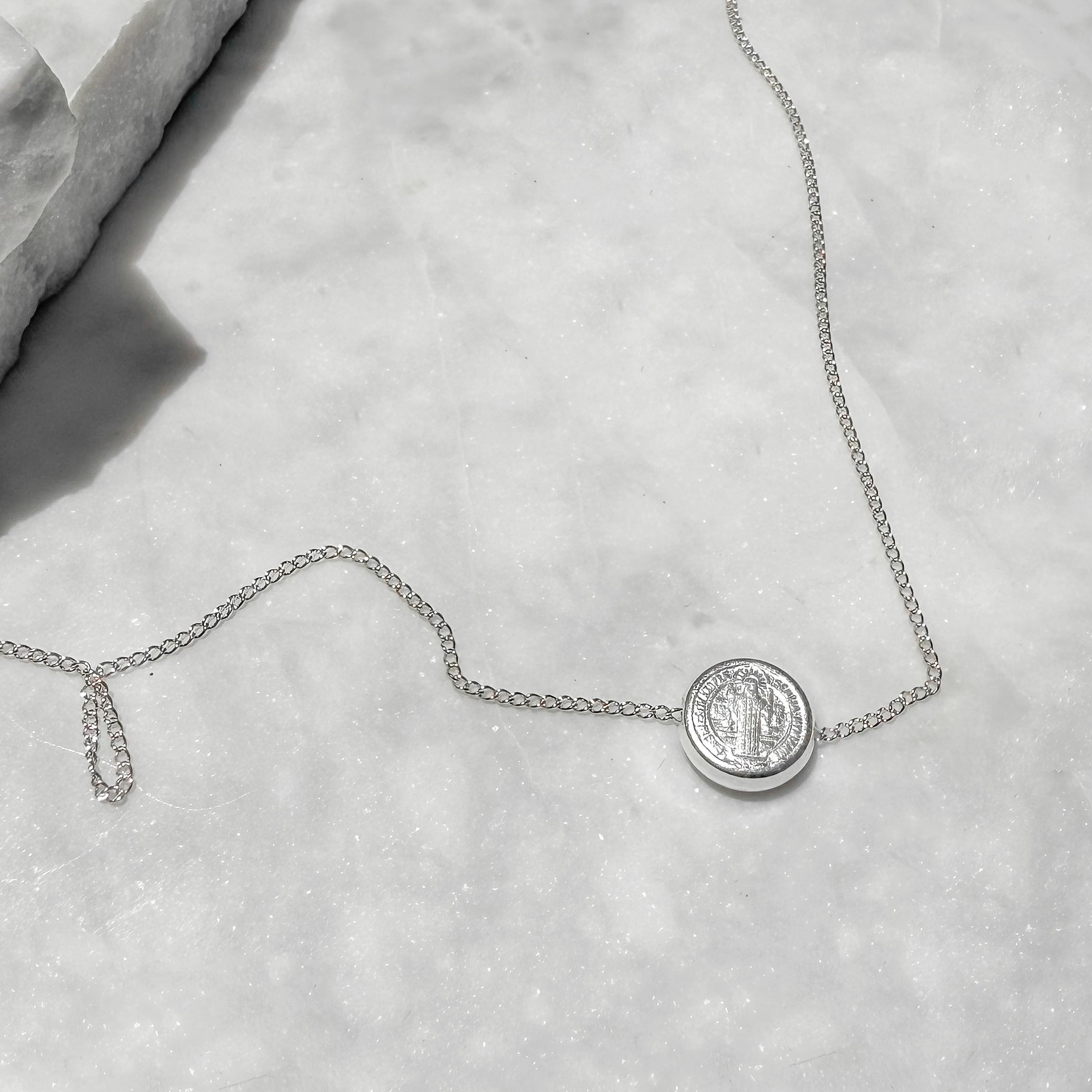 A two-sided Saint Benedict coin bead, threaded onto a fine flat curb chain or suspended from a slinky box chain.