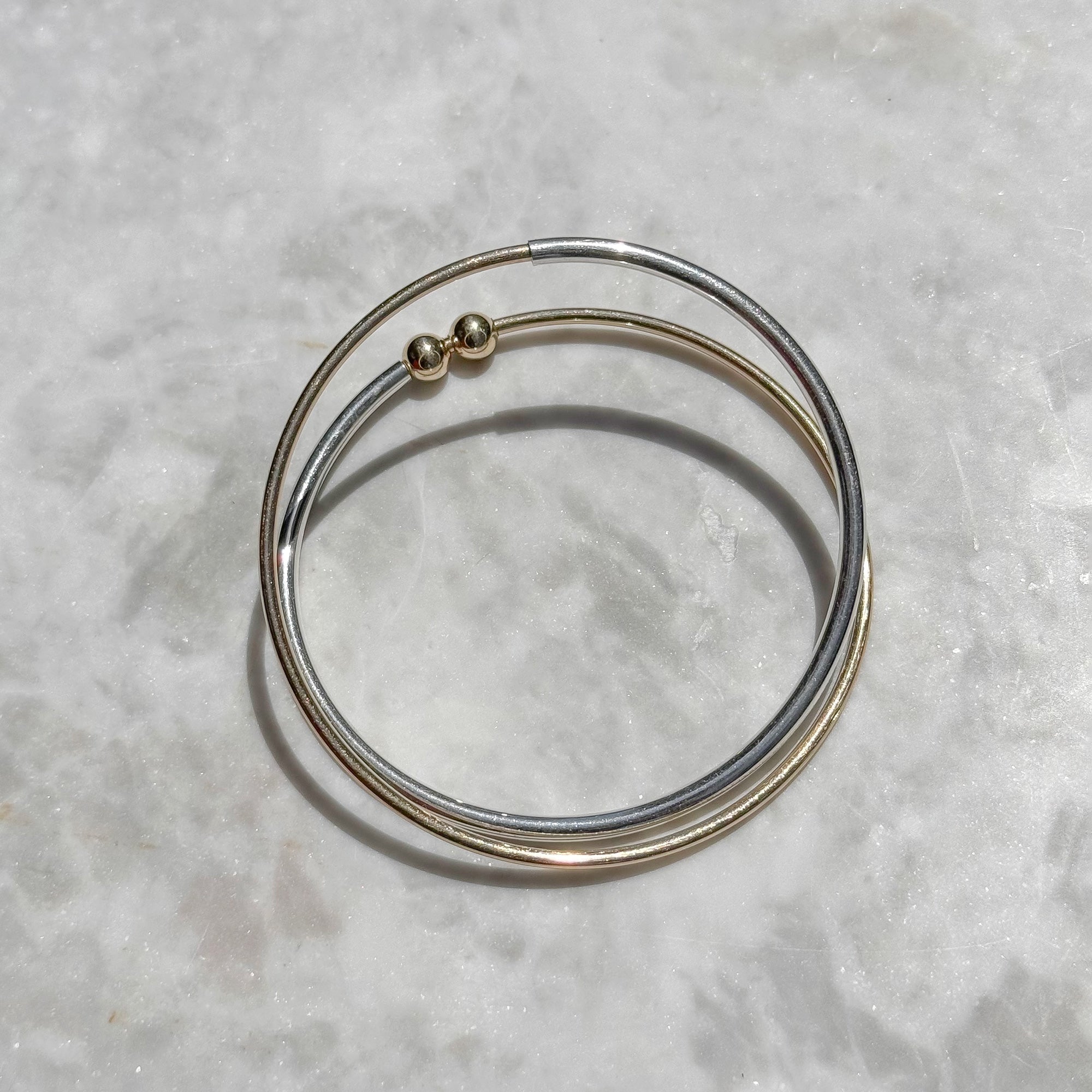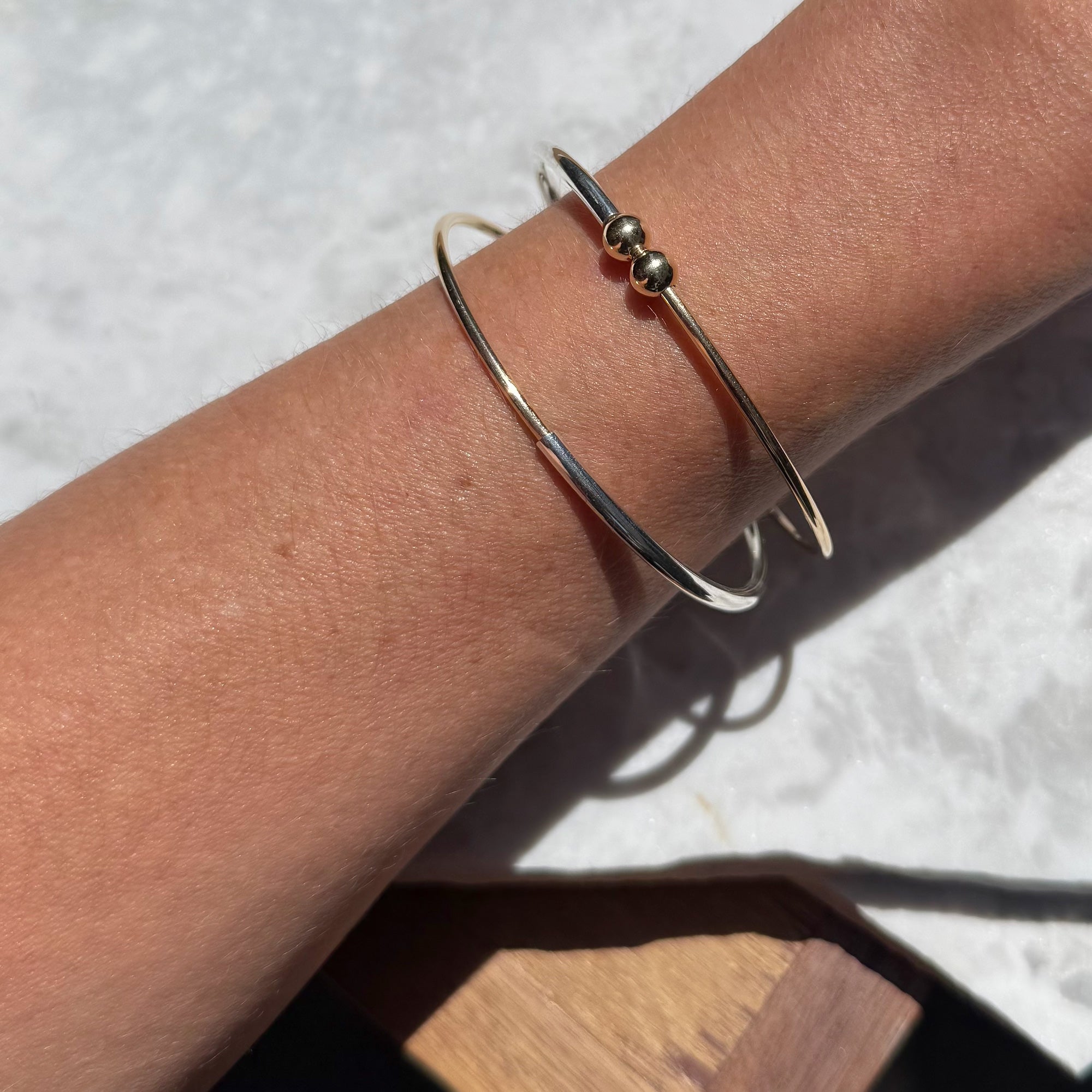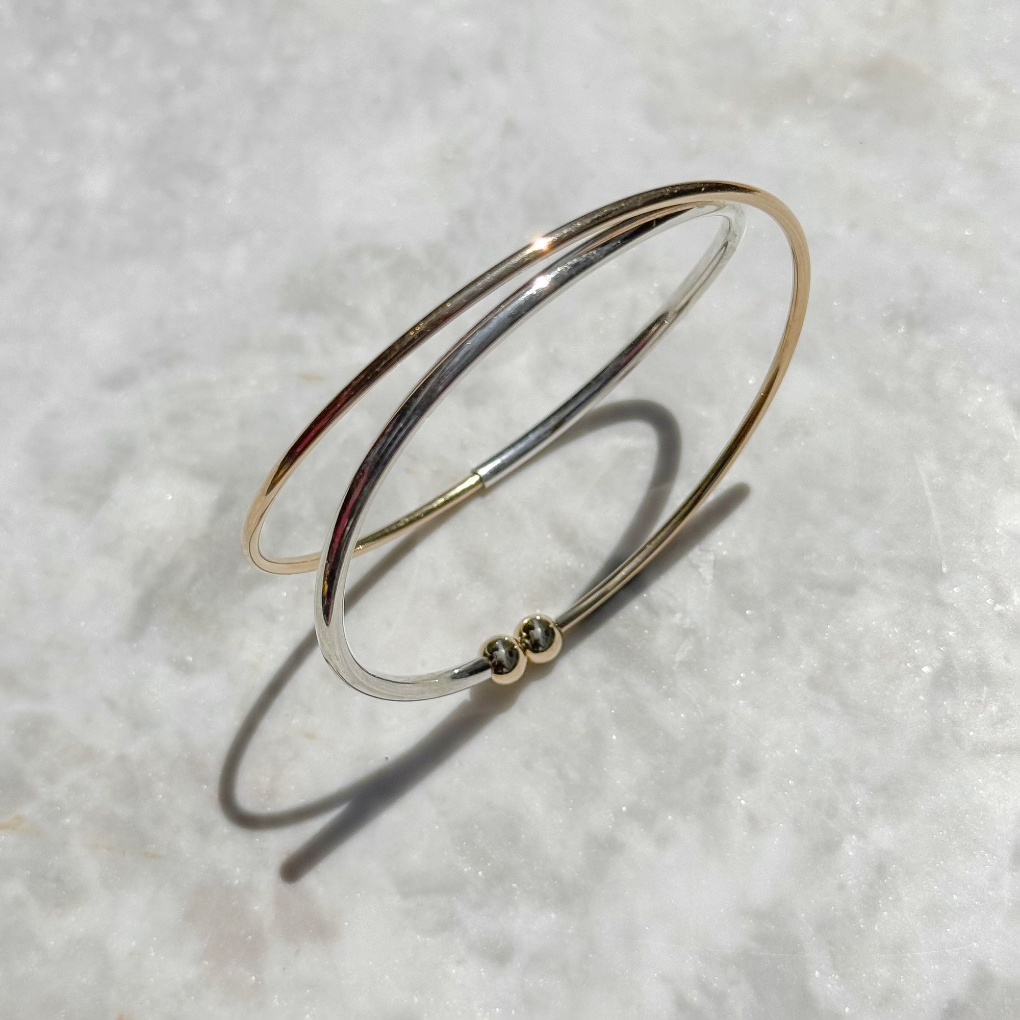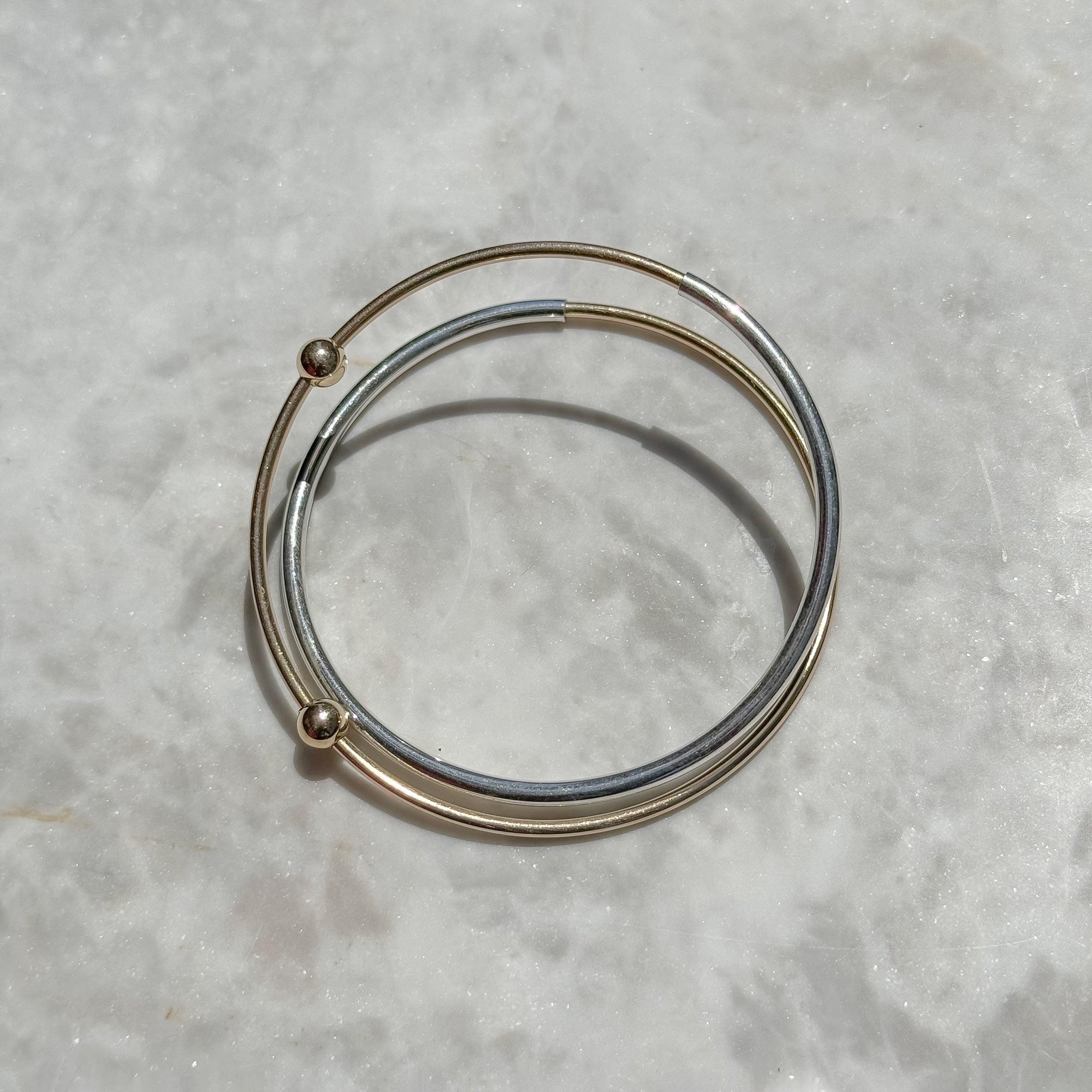 Crafted from thick gauge wire, this sculptural piece features two orbiting gold beads that move effortlessly around the form. Visually fine yet deceptively strong, it has a beautiful lightness to the eye — but when worn, you feel the quiet toughness and integrity of the heavier gauge.
