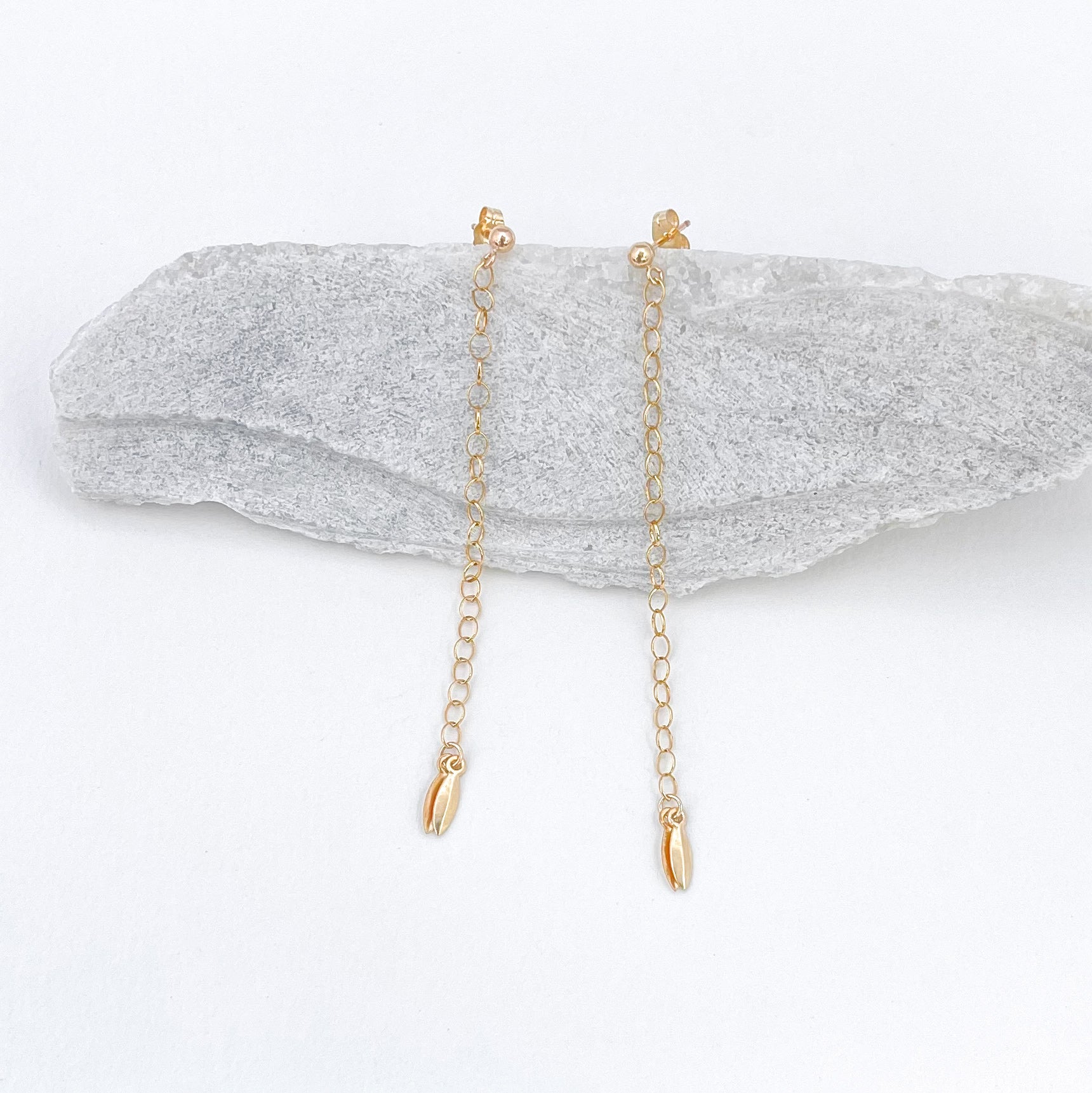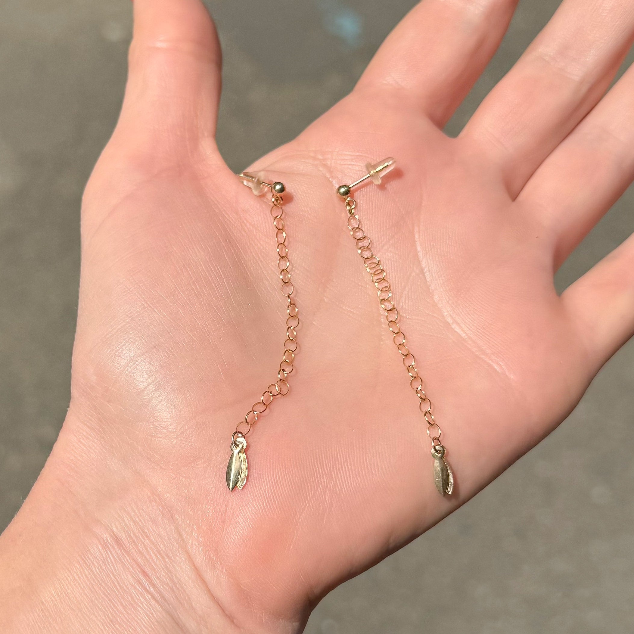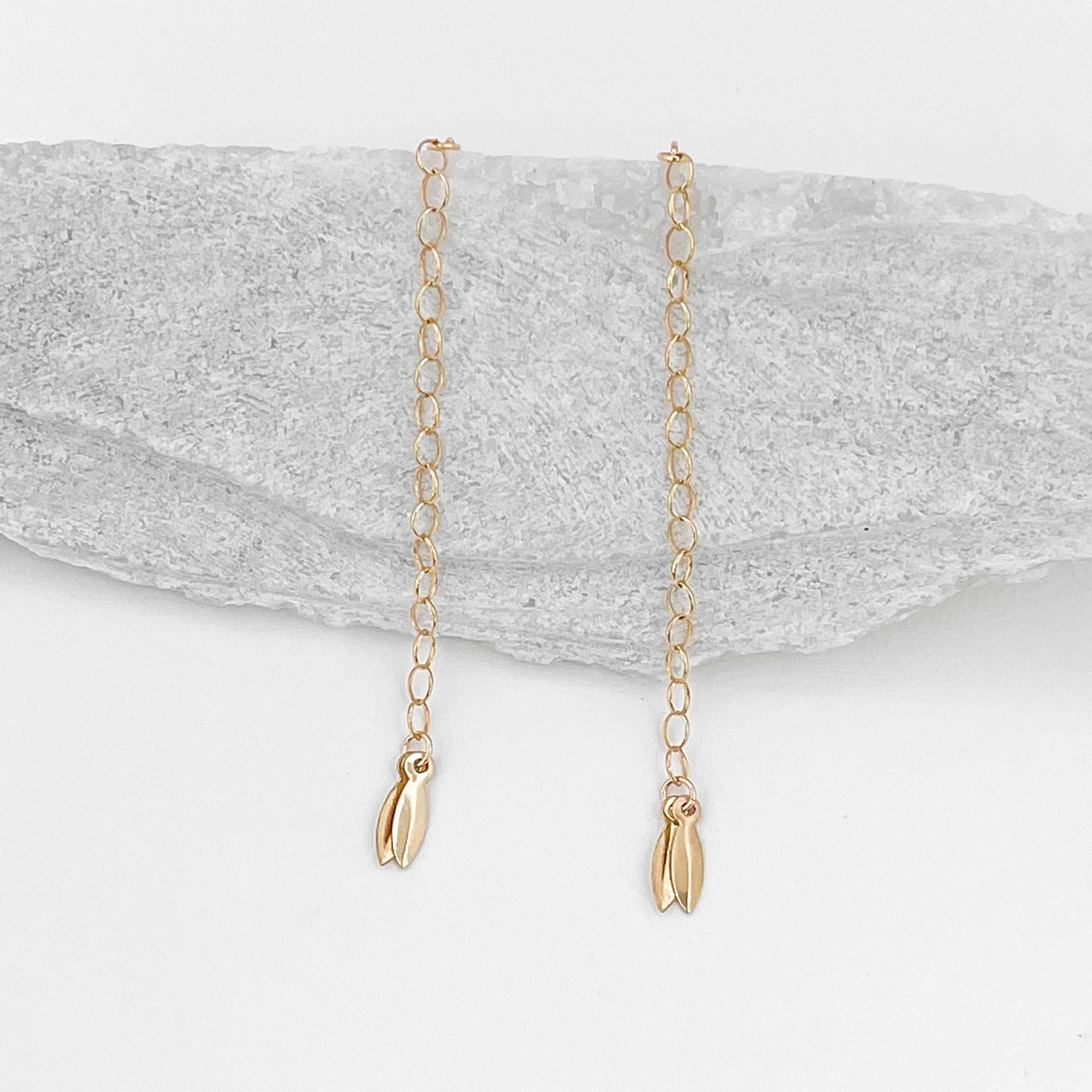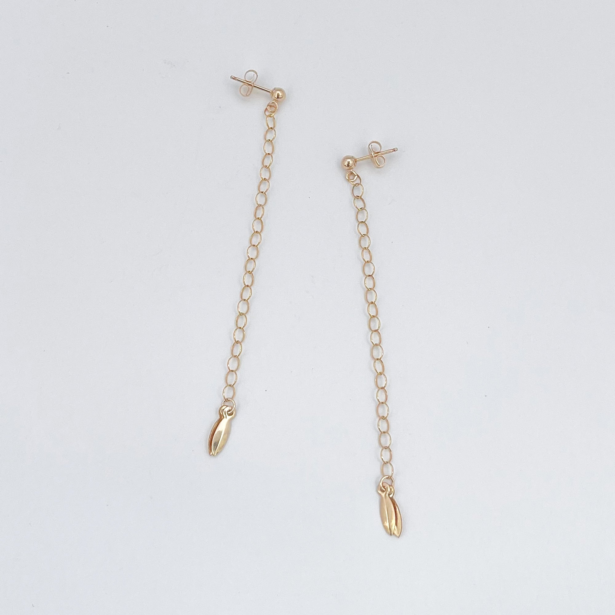 Extra long gold chain drops with marquise charms. Great length with our any weight on your lobe.