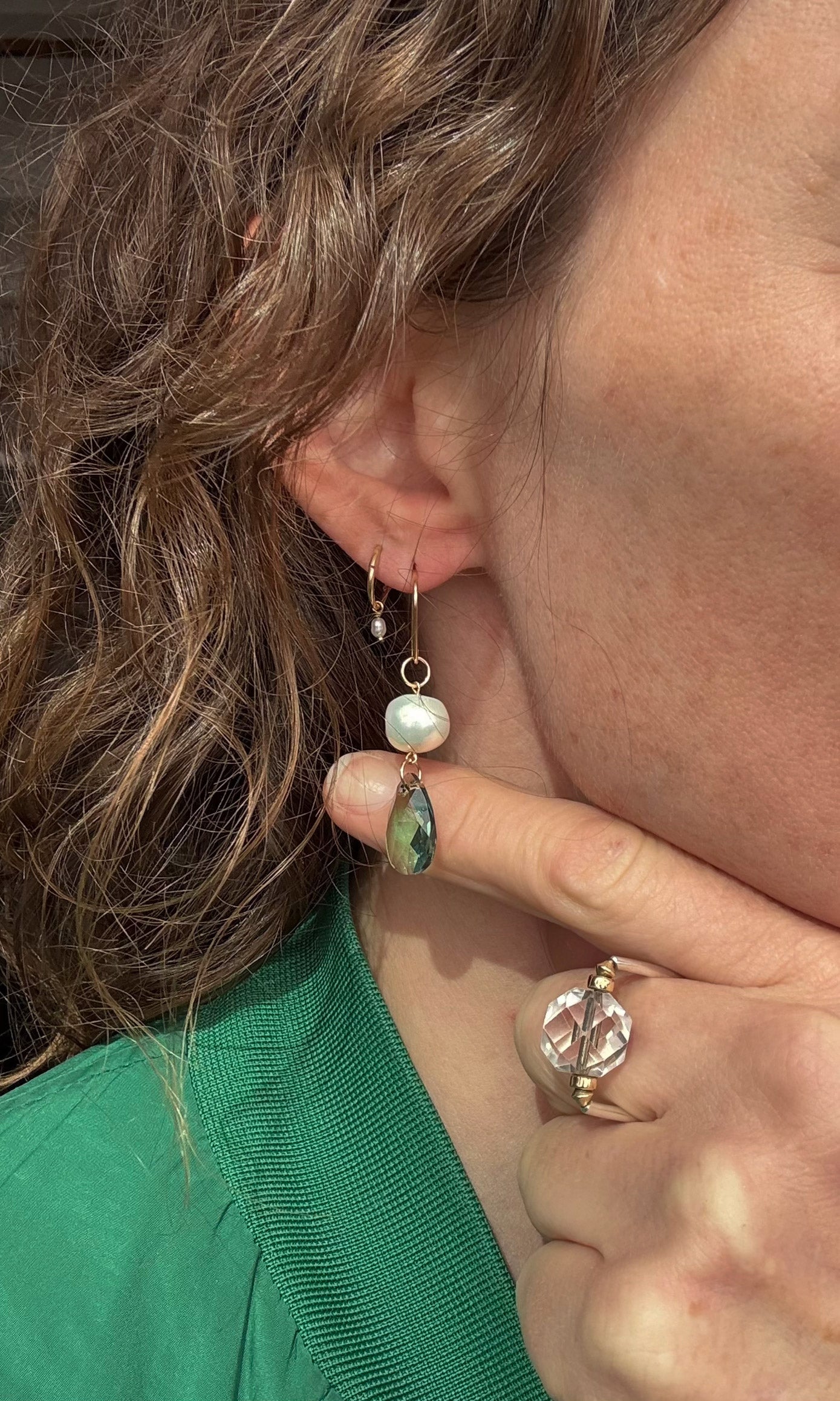 Light catching faceted crystal drops with beautifully wobbly round freshwater pearls. Love the little dance they do from your lobes :)