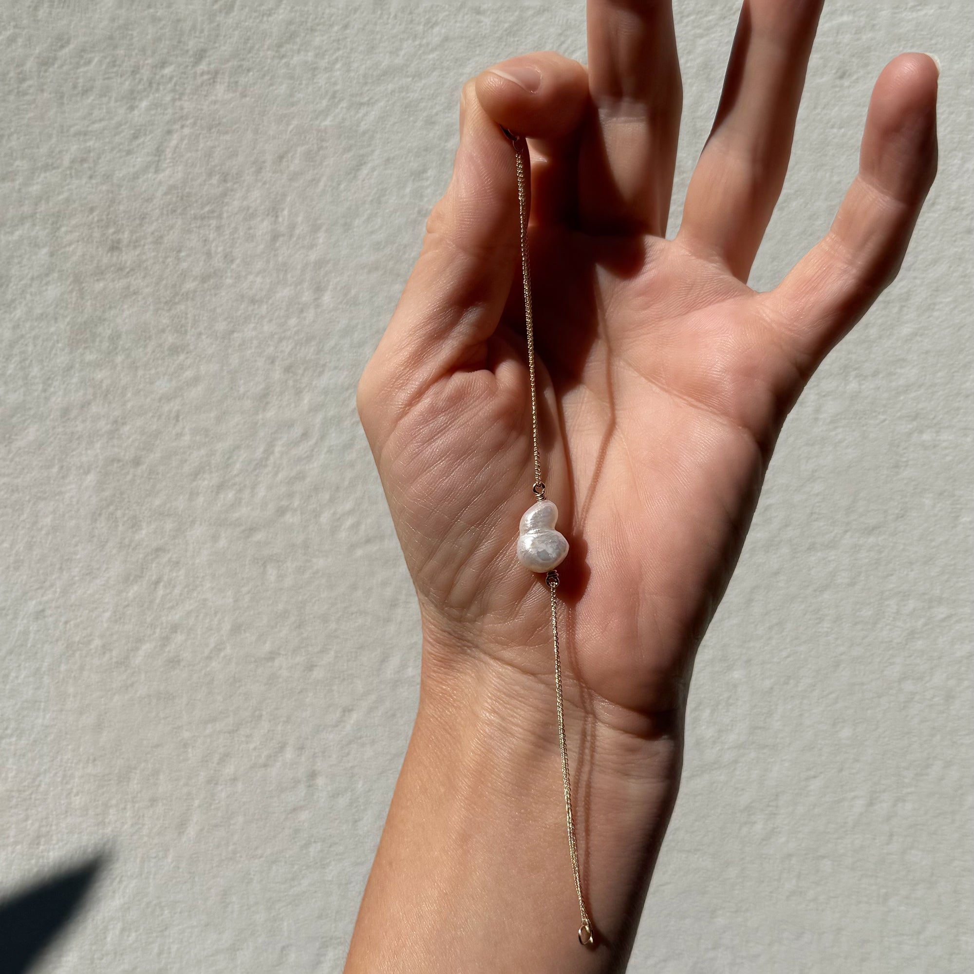 One-of-a-kind cloud-shaped freshwater pearl on a double gold chain.